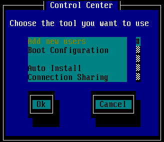 如上為 drakconf 的主要圖示,在這些畫面中,除了要您以鍵盤輸入文字的時候會有底線之外,其他的時候,只要移動『上下左右』、『空白』、『tab』及『Enter』等按鍵操作即可!drakconf 主要僅是將幾個小工具彙整成為一個啦!那麼這個 drakconf 底下彙整了哪些小工具呢?看看上面的圖示,您會發現有底下幾個個別的小工具:大概就是這樣啦!底下我們分別來說一說各個工具的內容吧: