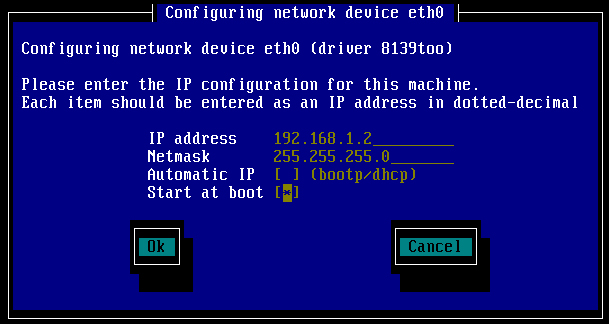 好了,底下要開始給他設定一下你的網路囉!在這個例子中,首先我們使用固定制的方式,使用了 192.168.1.2 這個私有 IP ,然後選擇不要 bootp/dhcp ,並且設定在開機的時候啟動,因此勾選 Start at boot !