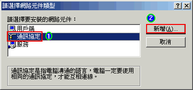 由於區域網路是由一些網路的通訊協定所驅動形成的(關於各種通訊協定請參考 study-area 的說明),所以請一定要在網路的組態內加入下列的通訊協定,當然,在您網域內的所有電腦均需要做以下的設定!要確認您的設定有沒有問題,請到這裡一步一步的檢查一下您的設定喔!OK!那我們開始安裝通訊協定吧! 請特別注意,除非你的網路系統中有 IPX/SPX 之類的伺服器,否則就不要安裝 IPX/SPX 這一個通訊協定,不然你的 Windows98 連 Windows2000 的速度會跟烏龜一樣慢喔!TCP/IP NetBEUI(或 NetBIOS )