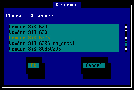 在按下了Graphic Card之後,會出現可以選擇晶片組的畫面來,如下圖所示,在下圖中,基本上會有三個欄位,第一個Vendor是說廠商,第二個SIS則是發展的廠商名稱,例如你的顯示卡是Nvidia的,那麼就選擇Nvidia吧!第三個則是這個廠商的支援晶片組!嗯!選擇你的顯示卡吧!我這裡是使用SIS的6326啦!