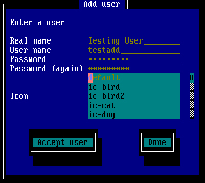 那個 User name 才是『帳號』,至於 Real name 則是在 /etc/passwd 當中的第五欄說明欄的內容啦!輸入完畢之後就給他 Accept user 即可! ![]()