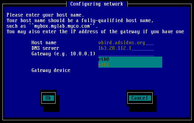 不過,如果你是使用 Cable 的話,或者是您公司有架設 DHCP 主機的話,那麼上面的圖示中,你就需要選擇『Automatic IP 』這一項!而其他的就直接設定的跟我一樣即可!這可是很重要的!然後再設定你的主機名稱與 ISP 給你的 DNS 的 IP,還有 Gateway 或者是 Gateway 的裝置!像我是以 eth1 做為對外的網路卡,因此就選擇 eth1 囉!