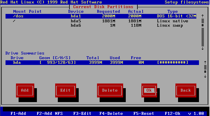 鳥哥的硬碟規劃為: 1GB windows98 + 5GB Linux ,多重開機選單!先假設你對於硬體的瞭解還算可以(亦即你可以自己將舊的零件組裝成一台新的電腦!),在你將所有的零件組合好之後,就要開始進行你這部主機的作業系統規劃了。由於各軟硬體廠商所開發的驅動程式畢竟還是以微軟的 Windows 系統為主流,而你要確定你的系統有沒有問題時,通常也是使用 Windows 的隨插即用的功能去捉你的硬體。也曾在網路上聽說過,當你的 Linux 硬體設定有問題時,可以在 Windows 中察看其 IRQ 與 DMA 等硬體設定,然後再回到 Linux 中去設定!