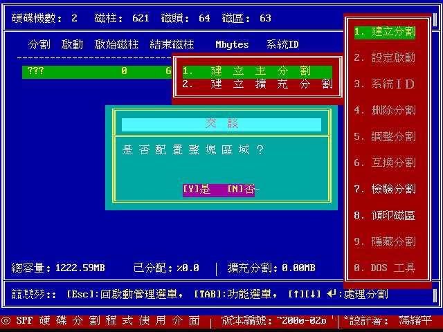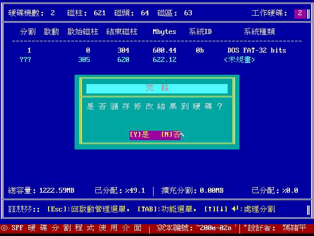 在這個畫面中,將游標以方向鍵移動至『刪除分割』這個項目,並按下 Enter : 出現此畫面後,確定要刪除這個分割就按『[Y]是』這個項目。 刪除分割之後你的硬碟中就沒有分割表的存在了,所以這個硬碟的系統種類則變成了<未規劃>。2. 建立主要分割磁區:在上面的畫面中,按下 Enter 鍵,會出現下面畫面。 由於這一顆硬碟的分割表被刪除了,所以『系統ID』與『刪除分割』被取消了。這時按下『建立分割』會出現如下畫面: 然後選擇『建立主分割』,那何謂主分割與擴充分割呢?所謂的主分割在 windows 系統下即是 『C槽』 啦!但是擴充分割並非『邏輯分割』,這裡要注意一下,所謂的『邏輯分割』是包含在擴充分割中的,例如當你的擴充分割共有 10GB 但是你想將之分為兩槽,則可以使用邏輯分割將擴充分割分為兩槽,這兩槽即稱為『邏輯分割』。所以這裡要注意啦,建立擴充分割的時候就要選擇『配置整個區域』啦!好!下一步按下『建立主分割』: 這裡會問你是否要將整個硬碟分割為僅有一個磁碟區?由於我們要將硬碟分為兩槽,所以這裡當然選擇『[N]否』啦! 由於你選擇了『不要配置整個區域為一塊磁區』,所以這時程式要你輸入你所需要的磁區。通常在第一步是輸入『啟始磁柱』,這時只要按 Enter 就可以啦,然後會要你輸入『結束磁柱』,結束磁柱的輸入方法有兩種模式,一種是輸入磁柱區,一種是輸入你所需要的 MB 數,通常我是輸入 MB 數啦,例如如上所示,我所需要的空間大小是 600MB ,所以輸入『+600』即可,而如果你的硬碟很大,你要輸入 4GB 時,則需要輸入 『+4000』,以此類推!輸入『+600』並按 Enter 之後出現如下畫面。 這時出現了你剛剛劃分的硬碟資訊啦,由於我們是劃分為 DOS 分割區,所以系統種類是 FAT-32 ,而 ID 則為 0b 。至於另外尚未劃分的就會顯示為 <未規劃> 啦!如果你還需要再繼續劃分的話,這時將游標移動至 <未規劃> 的那一個磁區按 Enter 後選擇『擴充分割』即可繼續劃分。如果劃分完畢之後,當然就是貯存分割表囉。這裡注意一下,因為剛剛的動作均尚未完成貯存的工作,所以要反悔還來得及!3. 貯存分割表:接下來要做貯存的動作了,按下『Esc』鍵(鍵盤左上角那個鍵)後會出現如下畫面: 按『[Y]是』,將剛分割好的分割表貯存至硬碟中!然後出現如下畫面:![]()