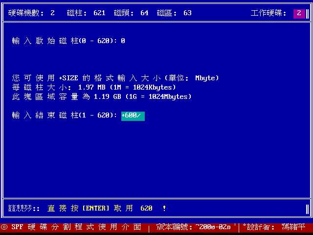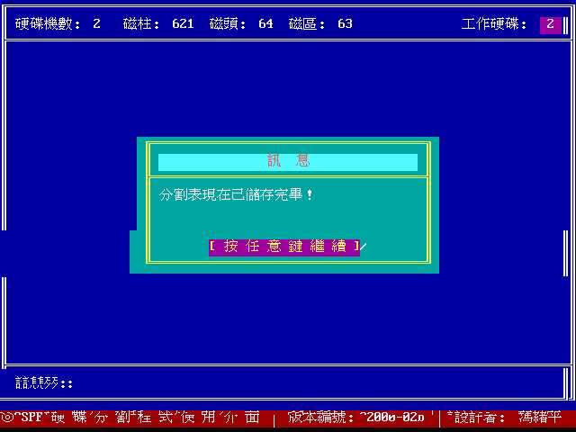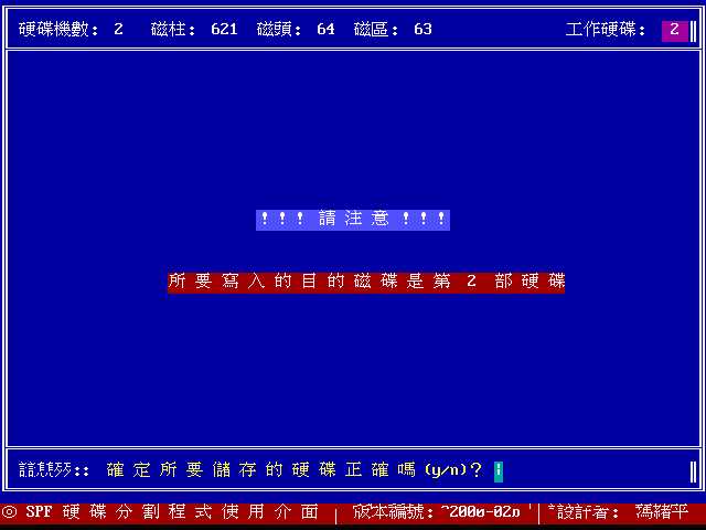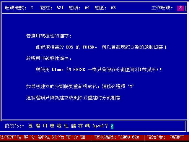 這裡的動作是連續的:4. 格式化硬碟這樣一來你的硬碟就劃分完畢而且貯存啦!這時要做的就是重新開機並格式化硬碟。格式化硬碟可以使用 DOS 的 Format ,當然也可以使用 spfdisk 的內建功能喔!