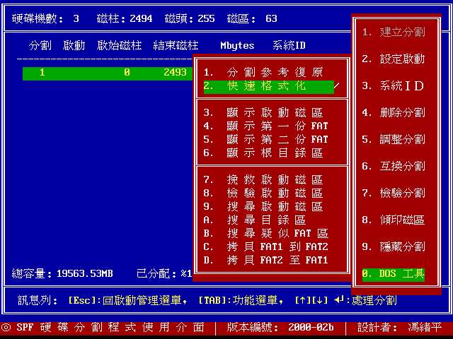 再進入剛剛你劃分完畢的那個硬碟區,按下 Enter 之後會出現一串選單,然後最下方的選單為 『DOS 工具』,選擇這一項並按 Enter 後,會出現另一個選單: 在這個次選單中的第二項即是快速格式化,這個格式化的動作非常的快喔!比 DOS 的格式化快多了!不過,這裡也必須指出一個問題,那就是若你的硬碟有壞軌的話,那最好還是使用 DOS 的 format 比較完整一點。