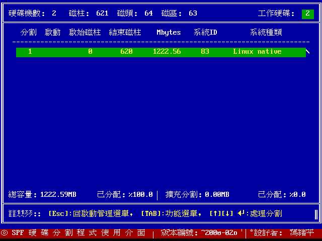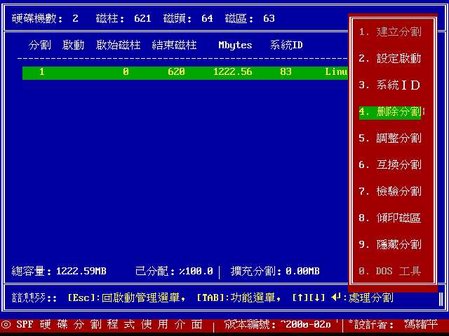 SPFdisk 是一套由國人開發完成的全中文介面的硬碟分割工具,他要比微軟出的 Fdisk 功能強多了,他的好處除了==>全中文介面讓你一定可以看的懂之外,簡單的類圖形介面可以讓你輕易的進行硬碟分割,除此之外,這套軟體的『DOS工具』內的『格式化工具』格式化硬碟的速度真是 DOS 比不上的,我格式化一個 30GB 的硬碟不用十秒就可以格式化完全!<==另外,其他的優點我在此也不多說了,若有需要你可以自行自一些搜尋網站下載最新的程式,或從這裡下載我有的程式,不過可能舊一點。另外,由於 DOS 的 Fdisk 並不認識 Linux 的分割表,所以用 DOS 的 Fdisk 是無法將 Linux 的分割表去除的。因此,你要刪除 Linux 的分割表,只有兩個比較快的方法,一個是以 Linux 直接再分割,一個則是使用 SPfdisk 分割啦!