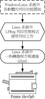 [root@test root]# id lp uid=4(lp) gid=7(lp) groups=7(lp) 萬一出現了『 id: lp: No such user 』時, 請務必進行底下的動作,以新增印表機管理員帳號: groupadd lp useradd -s /sbin/nologin -d /var/spool/lpd -g lp -r lp mkdir -p /var/spool/lpd/lp0 chown lp:lp -R /var/spool/lpd 如果您的系統當中早就已經有了 lp 這個帳號,那麼上面的動作就不需要進行! 1. 先設定好 printcap 這個主要設定檔! [root@test root]# cp /etc/printcap /etc/printcap.bak.raw#只是備份 [root@test root]# vi /etc/printcap # 如果是使用 Tarball 安裝的,這個檔案在 /usr/local/LPRng/etc/printcap lp0|HP-LaserJet-1100:\ :sh:\ :ml=0:\ :mx=0:\ :sd=/var/spool/lpd/lp0:\ :lp=/dev/lp0:\ #上面說明的是: # lp0 為印表機在 Linux 的名稱,HP-LaserJet-1100 為印表機 lp0 的別名 # 請注意, HP-LasetJet-1100 可以隨意設定,但是 lp0 最好保留, # 因為未來比較容易處理一些突發狀況! # sh 為是否印出標頭,這裡我們沒有設定標頭喔! # ml, mx 為印表機能夠接受的訊息,這裡我們不加限制! # sd 為列印工作的佇列(列印檔案暫存的目錄) # lp 就是印表機的實際裝置代號了! # 事實上,重點僅在於 lp 與 sd 而已~ ^_^ [root@test root]#