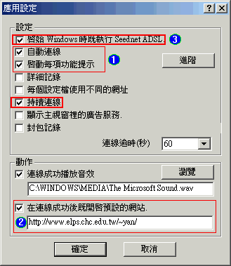 完成了上面所有的設定之後,從此,每部電腦一開機,便可以直接連上 Internet 啦!很簡單吧!註:各家 ADSL 固網公司所給的連線軟體都不太相同,而且不同的作業系統( windows98, windows me, windows2000 )所適用的連線軟體亦不盡相同,這裡僅是介紹一種連線軟體,你可以選擇適合你的作業系統的連線軟體幽!