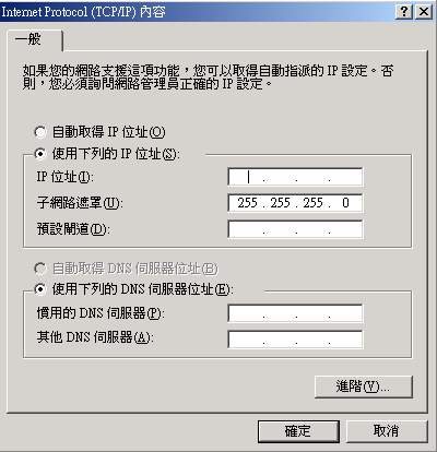 接下來則是輸入固定制時, ISP 給你的(1)IP(2)通訊閘(3)DNS等,按上圖中的『Internet Protocol (TCP/IP) 』這一項,會出現下面畫面,然後分別輸入你的IP,預設閘道(通訊閘)及 DNS,完成後按『確定』即可連線上網;