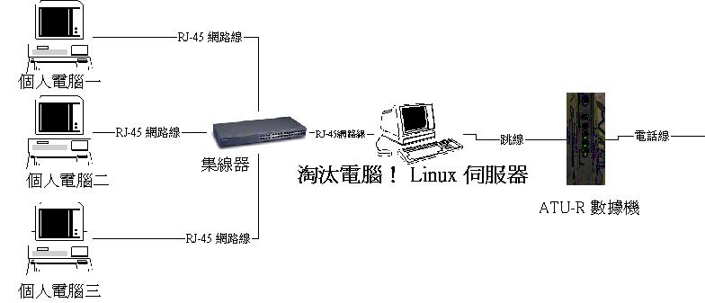 怎樣安裝第二塊網路卡呢?就是將 Linux 關機囉,然後安裝第二塊卡,然後開機,然後就可以自動的被捉到囉!如果無法被自動的捉到,那麼就麻煩了!請參考這一篇看看如何安裝第二塊網路卡吧!連上 Internet另外,全部的硬體連接之後是怎樣呢?可以這樣看:所有硬體連接完畢之後就會像底下的圖示這樣!