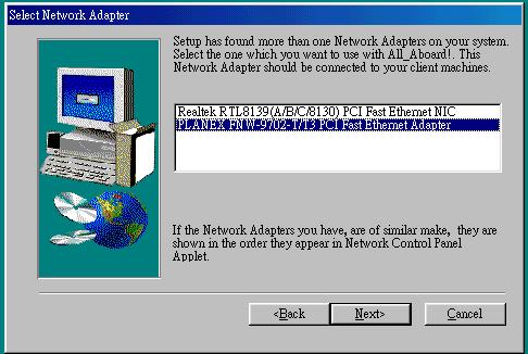 5. 在按下了 Next 之後,會出現要你選擇網路卡的設備。由於我們只有一張網路卡,所以下圖其實只有一個網路卡的型號。因此,你直接選擇空白框框裡的網路卡之後(你的網路卡型號與鳥哥的會有所不同喔!),再按下 Next。