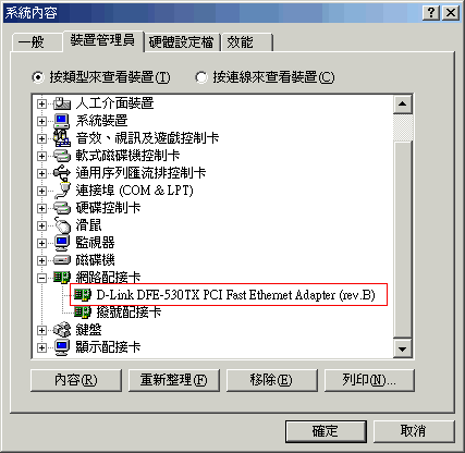 確認硬體安裝完整硬體安裝完畢之後,請一定要到系統(開始-->設定-->控制台-->系統)中的『裝置管理員』去看看你的網路卡有沒有問題!!如下圖所示: 如果有問題的話,在下面的圖示中,點選網路卡那一項,選擇『移除』,之後再按『重新整理』即會捉到網路卡,然後再將驅動程式的安裝路徑指向正確的地方(通常是 A 槽或是 CD-ROM)。如果你的網路卡太舊,以致於沒有網路卡的驅動程式,建議你來老伯的硬體小站看看: 通常第一次安裝網路卡後,系統都會給兩個網卡的型式,一個是正確的網路卡(如下圖框起來的部分),另一個則是給傳統的撥號網路用的!如果你不用傳統的撥號網路(就是 56Kbps 那一種),這個介面是可以移除的! 如果你還是沒有辦法確定網路卡是否安裝完畢,請到這裡來看看如何解決!
