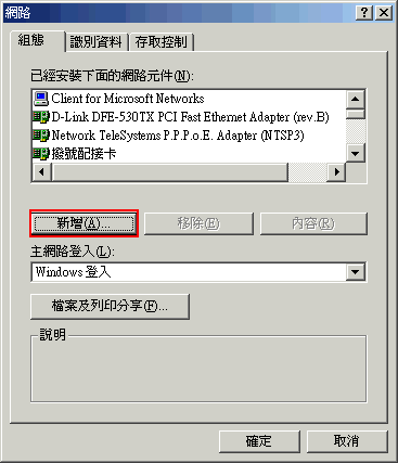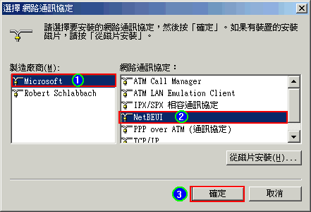 點選【Microsoft】-->點選【NetBEUI】通訊協定-->按【確定】鈕。按完『確定』之後會顯示成如下圖所示。重複上面新增的步驟,以增加其他的通訊協定。