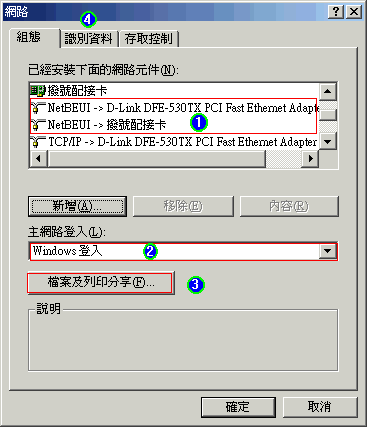 上圖的(1)即是剛安裝的【NetBEUI】通訊協定,先點選【Windows 登入】,通常我都將之改選為『Client for Microsoft Networks』這一項-->按【檔案及列印分享】鈕,將兩分享項目都加以核選!- 建立虛擬 IP 於每部電腦中