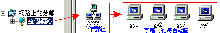 這裡要注意的是,由於工作群組設定不同的時候,你將會在網路上的芳鄰看不到你設定的其他區域網路上的電腦,要在『整個網路』中才會看到,所以請將每台電腦的工作群組名稱設定為一樣!而個別電腦的名稱請設定為不一樣!