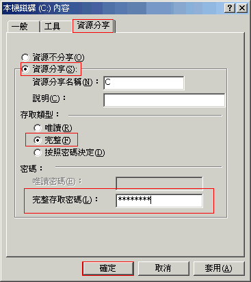 六、啟動網路上的芳鄰與資源分享裝置在檔案總管中,在想要分享的磁碟機或者是資料夾按滑鼠右鍵點選【內容】,如下圖所示: 在下圖中核選【資源分享】,請設定資源分享的名稱,然後存取類型可依個別喜好來設定,如果你這個資料很重要,不希望被刪除掉的話,最好選擇唯讀;但如果是一般家庭的網路系統的話,通常就直接設『完整』了,反正都是自家人,應該不會有人殺掉你的資料吧!!然後密碼可以設也可以不設。要注意的是,如果你選擇了『按照密碼決定』時,你就必須要輸入兩組密碼喔! 基本上,以上的設定就已經足夠了,再接下來就是每台電腦之間的連接方法了!