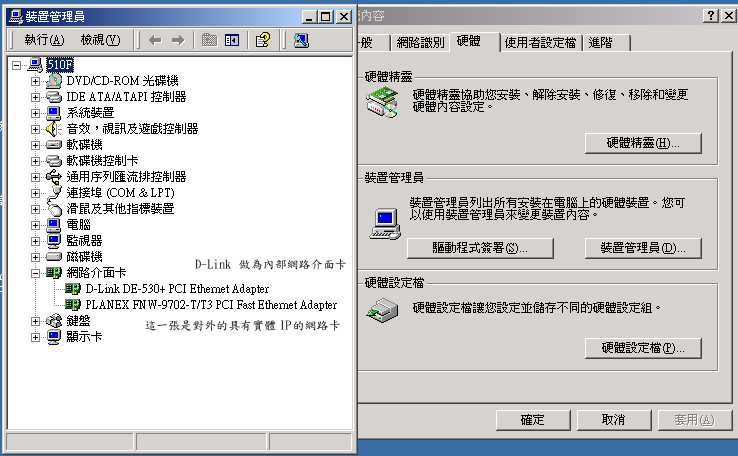 上面就明白的告訴你,這一張被作為內部網路的通訊閘的網路卡,其 IP 為 192.168.0.1 ,且子網路遮罩為 255.255.255.0,所以你在設定其他的電腦時