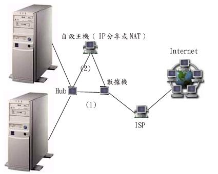 - 如果你是透過主機的話,那請以正常的網路線連接 Hub 與主機,然後以跳線連接主機與 ADSL 的數據機;