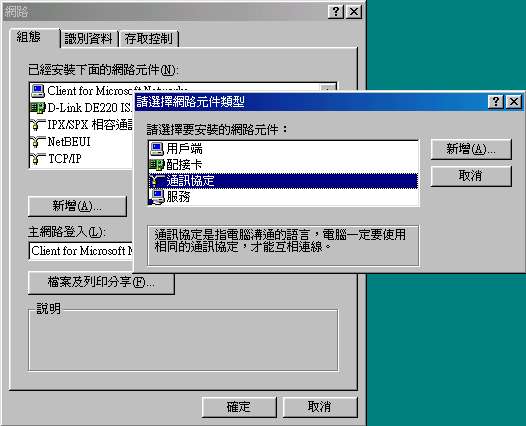 上面的『IPX/SPX相容通訊協定』、『NetBEUI』及『TCP/IP』均是網路上的通訊協定,通訊協定簡單的來講,就是網路上電腦與電腦可以互相認識的一種協定,如果你需要詳細的瞭解每一種通訊協定,可以來這裡看一下: