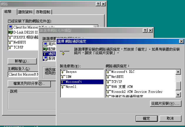再來則是於左邊選擇『Microsoft』,然後分別於右邊加入我們要的通訊協定即可,新增了通訊協定之後,電腦會要你放入 windows98 的光碟,並重新開機。