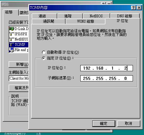 以下的例子為:你自己架設一個 Linux 主機,且主機已有開放 NAT 服務,另外,你的通訊閘的 IP 為 192.168.1.1,而欲連上這部主機的 PC 之IP 為 192.168.1.2。(如果你自己已經知道你所使用電腦的IP、通訊閘IP及DNS的IP時,那底下的設定也是合用的!)